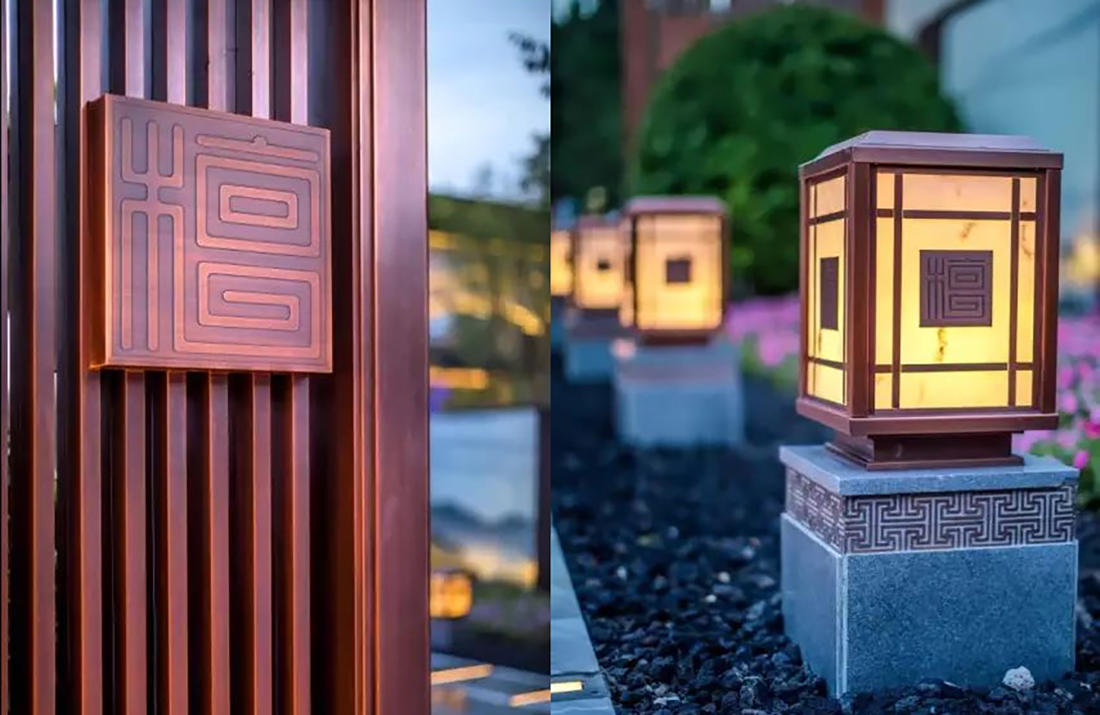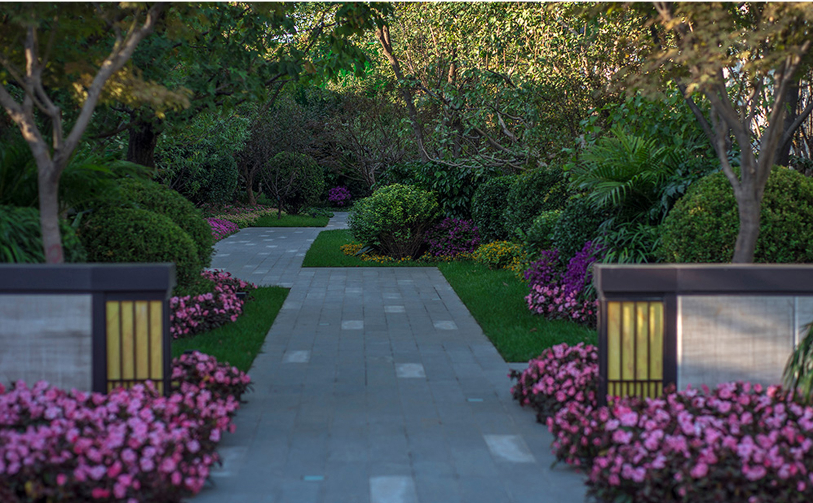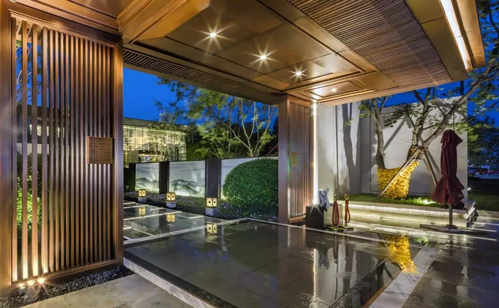 見(jiàn)禮檀園,府院初開(kāi),西入口門(mén)頭前場(chǎng)空間有限,景觀上采用 欲揚(yáng)先抑的手法,以大禮東方、神韻在心為意境,將景觀在門(mén)頭后進(jìn)一步表現(xiàn),空間組織人車分流,中軸步道以“檀” 字紋為核心,兩側(cè)以云入境,如焚檀香以籠煙,林蔭清淺,天色清雅,業(yè)主歸家自然心境平和。