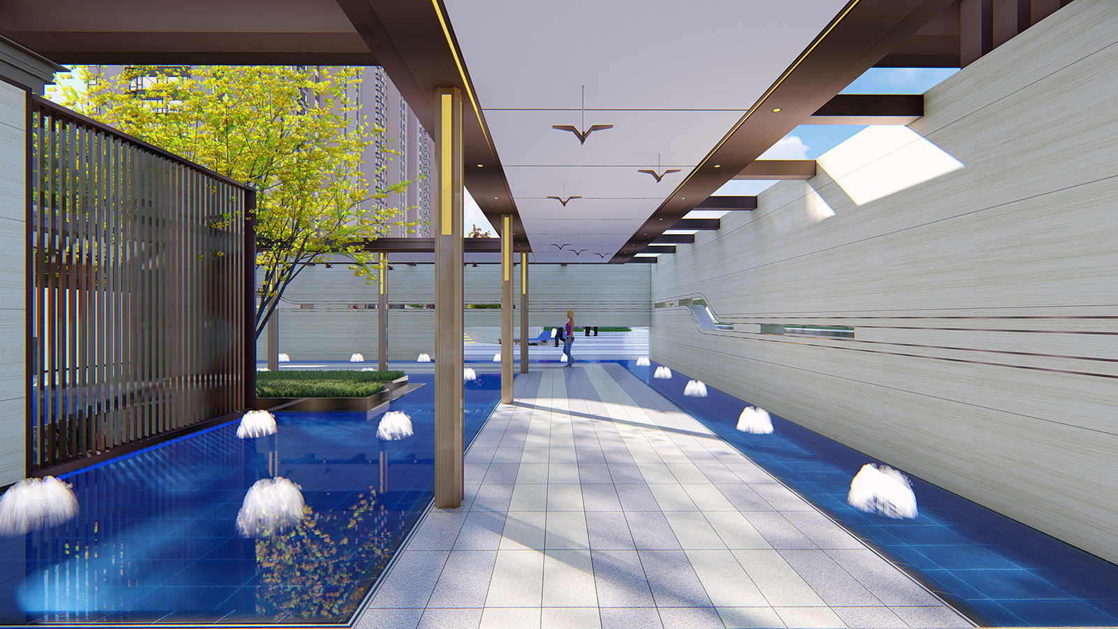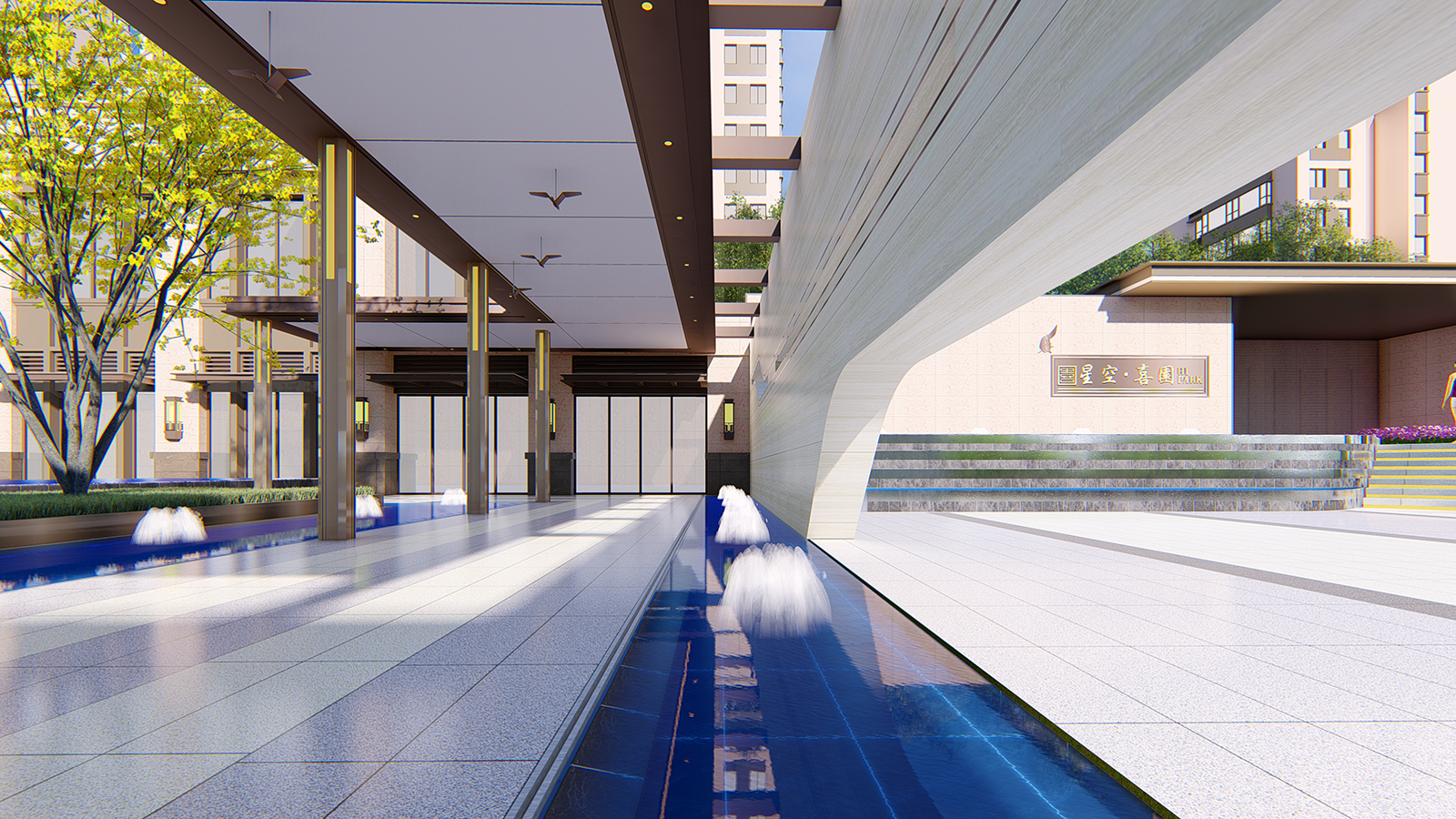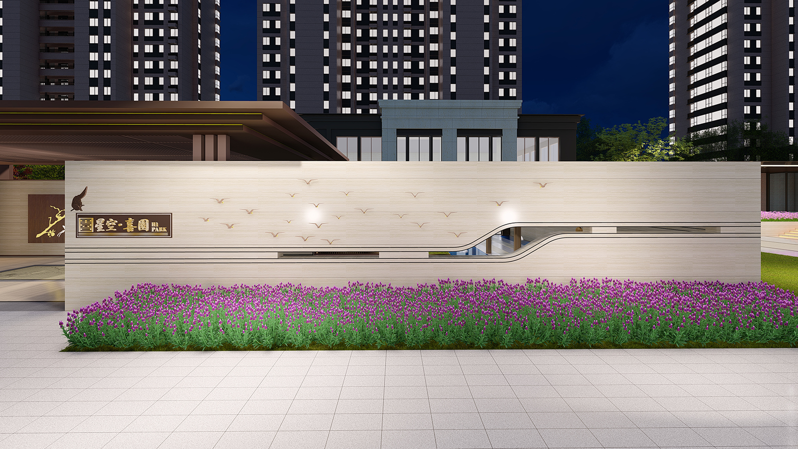 迎賓廣場平坦開闊,疊水水景與臺階組合現代、精致、優雅,水景布置有鵲歸巢主題雕塑,禮迎業主歸家,彰顯小區尊享品質。