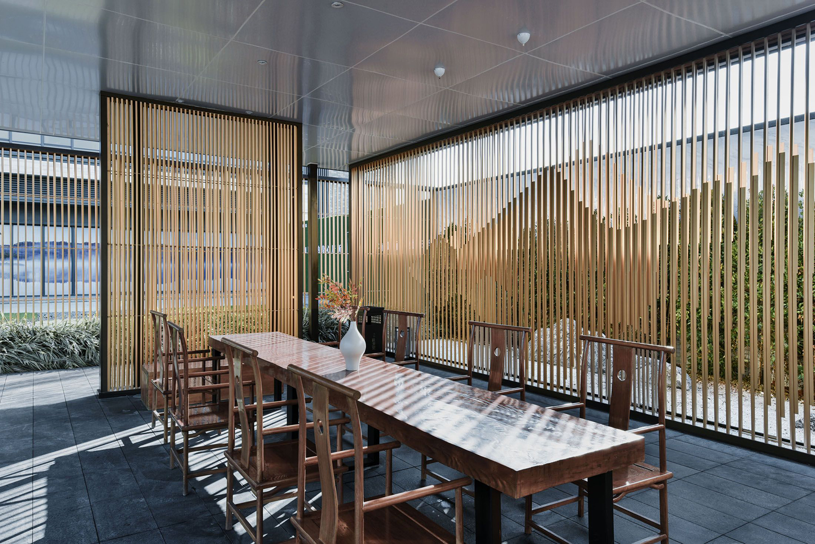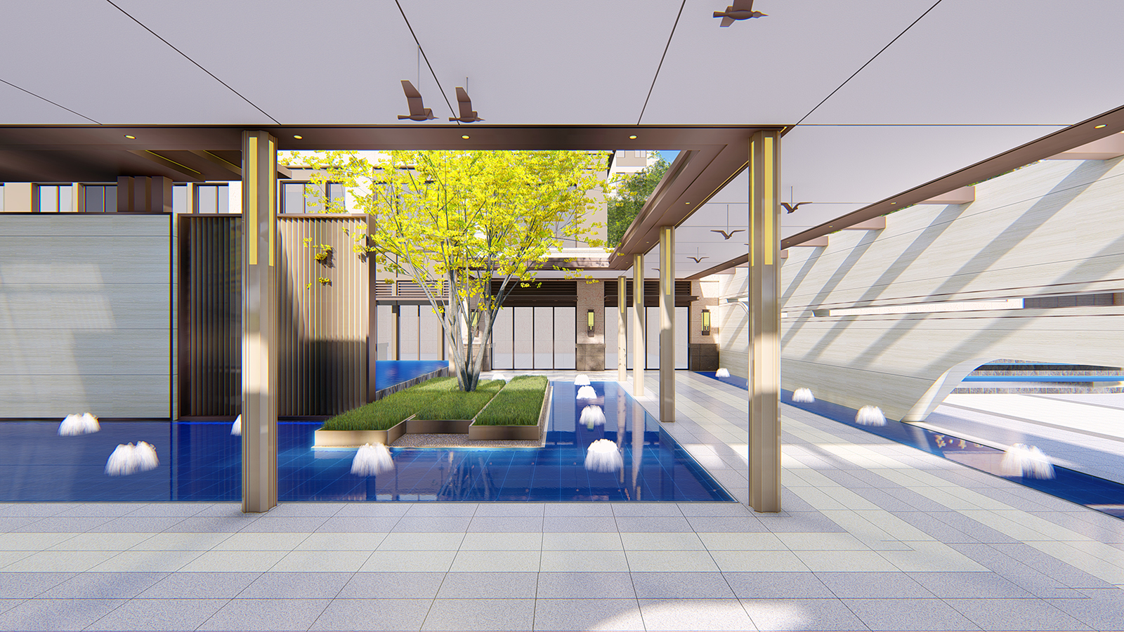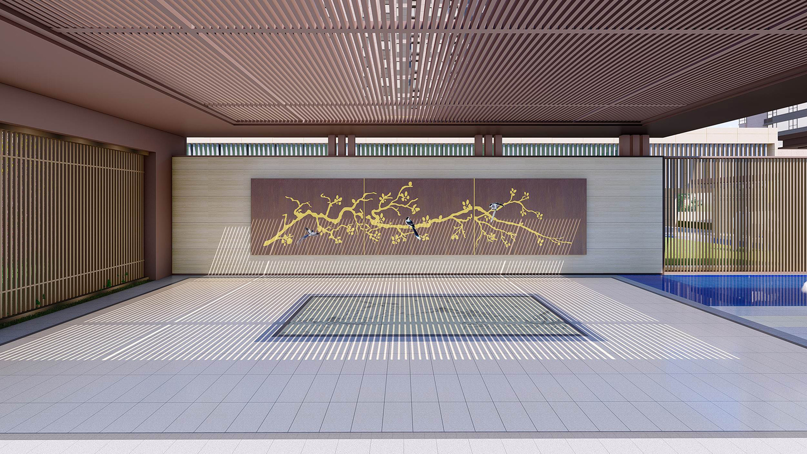 “L形”廊架給予客戶無形的引導,帶領客戶進入到更深層次空間,廊架頂板布置喜鵲藝術裝置,以雀幸喜歸為主題,引導賓客進入售樓部。