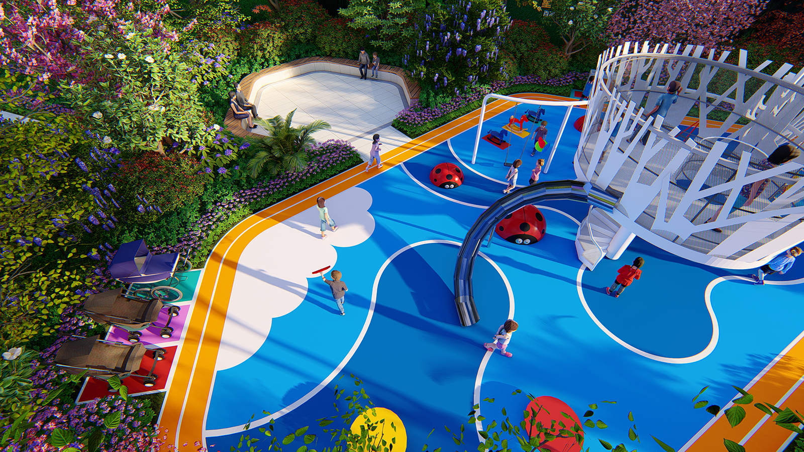 兒童樂園以親子同樂,喜鵲和鳴為意境,設置兒童體驗熱點,同時布置家長休閑看護區與洽談區,園路旁的喬木夾道種植,豐富的綠化層次,都能增強客戶對項目品質更加直觀的感受。