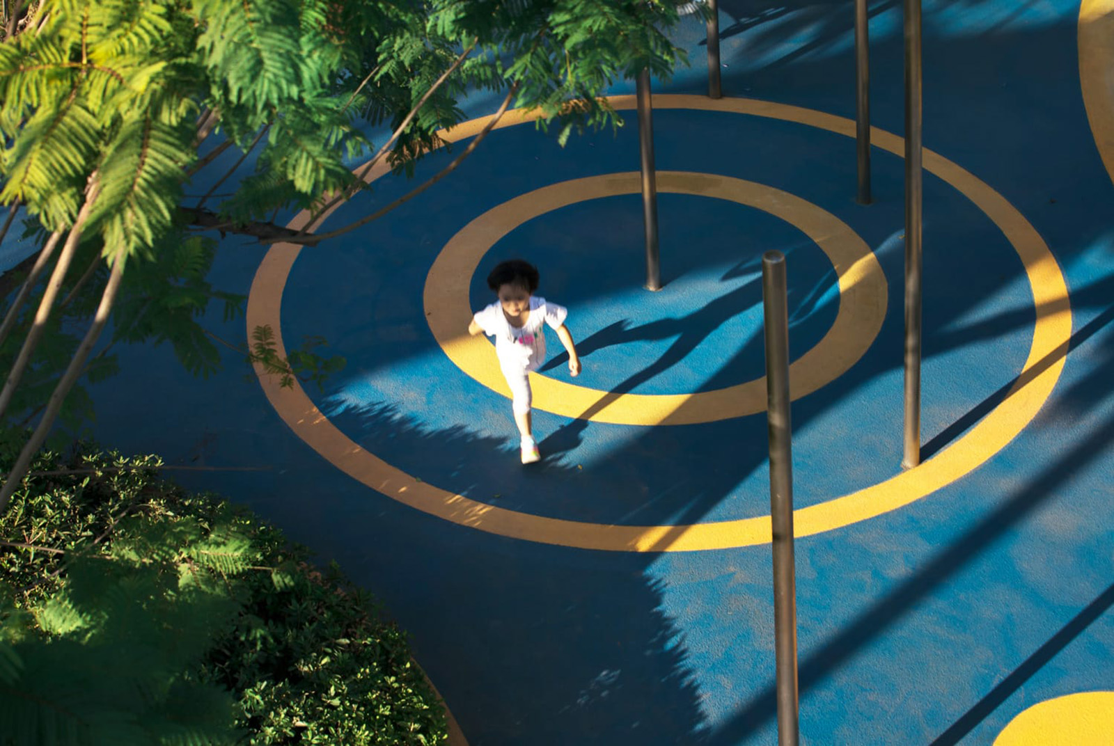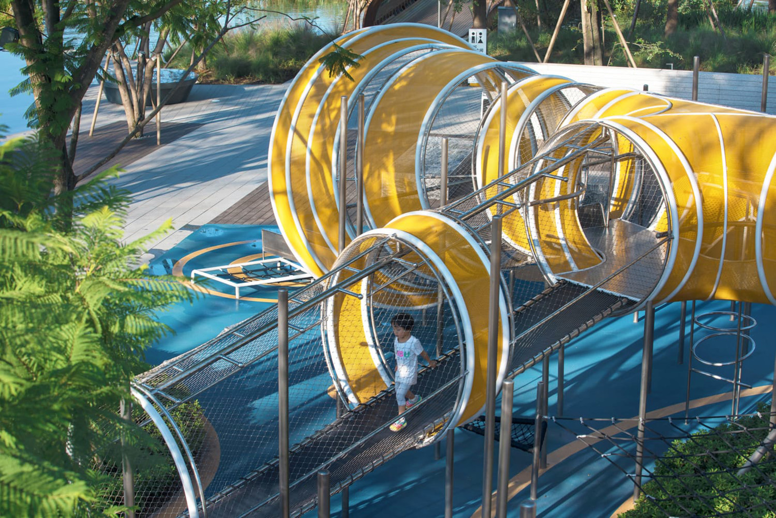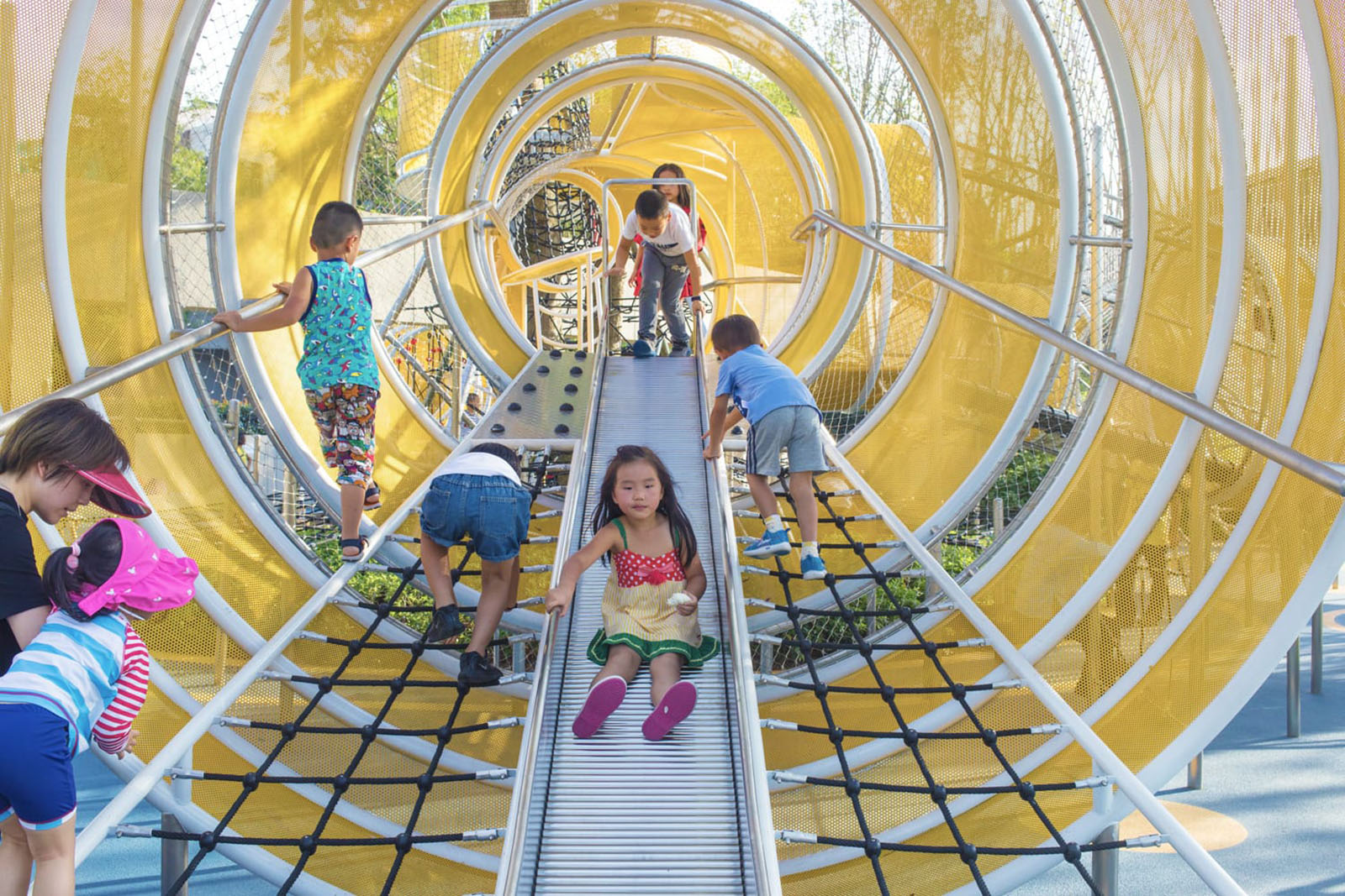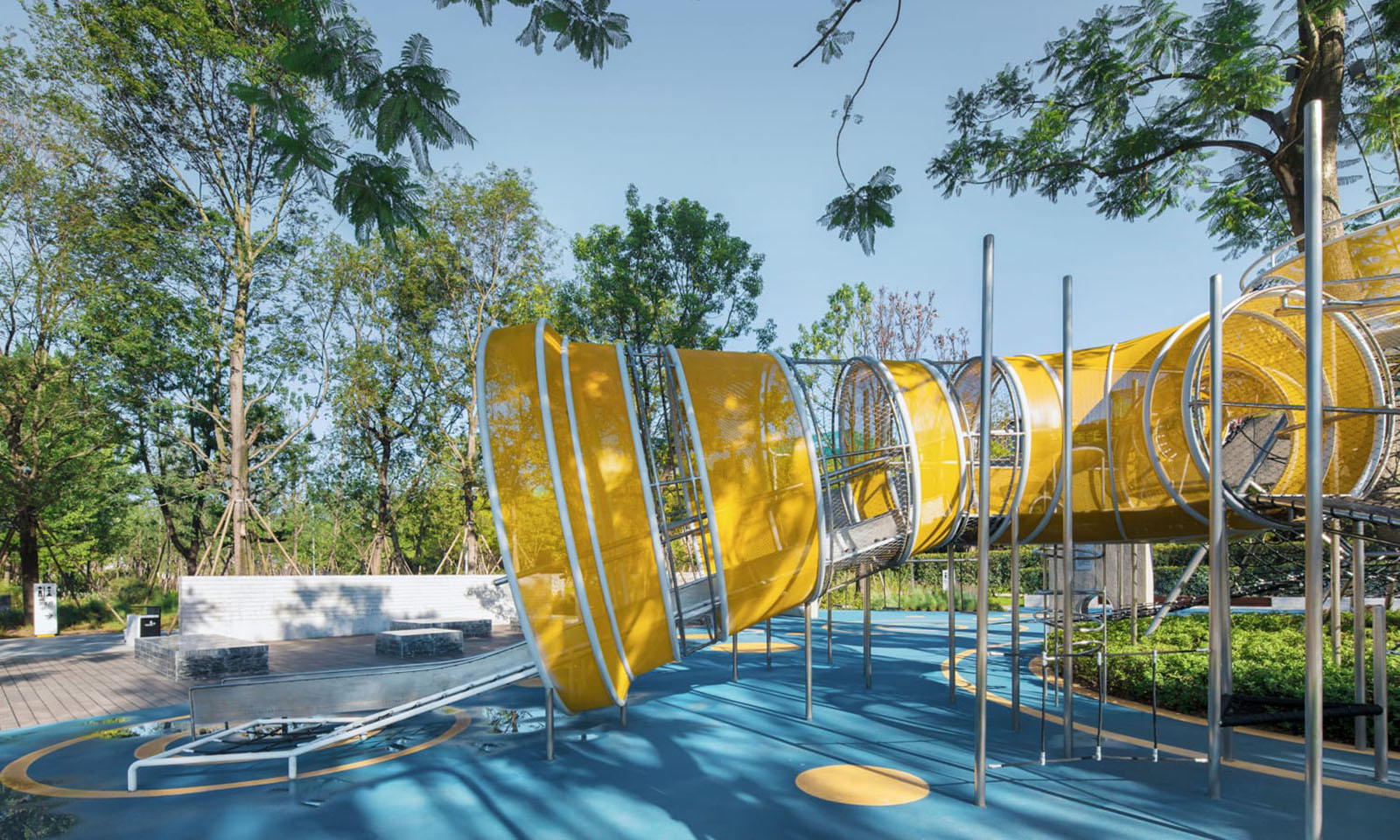 以學(xué)齡大童冒險為設(shè)計主題,架空的冒險管道、吊橋、方盒子滑梯等設(shè)計,激發(fā)兒童的探索欲、合作精神、冒險精神。拓展兒童的空間想象力。同時林蔭大樹與器械相結(jié)合,探險空間猶如穿梭、浮空在林中,兒童伸手能觸碰到大樹的枝條,更加增強了兒童與自然的互動。