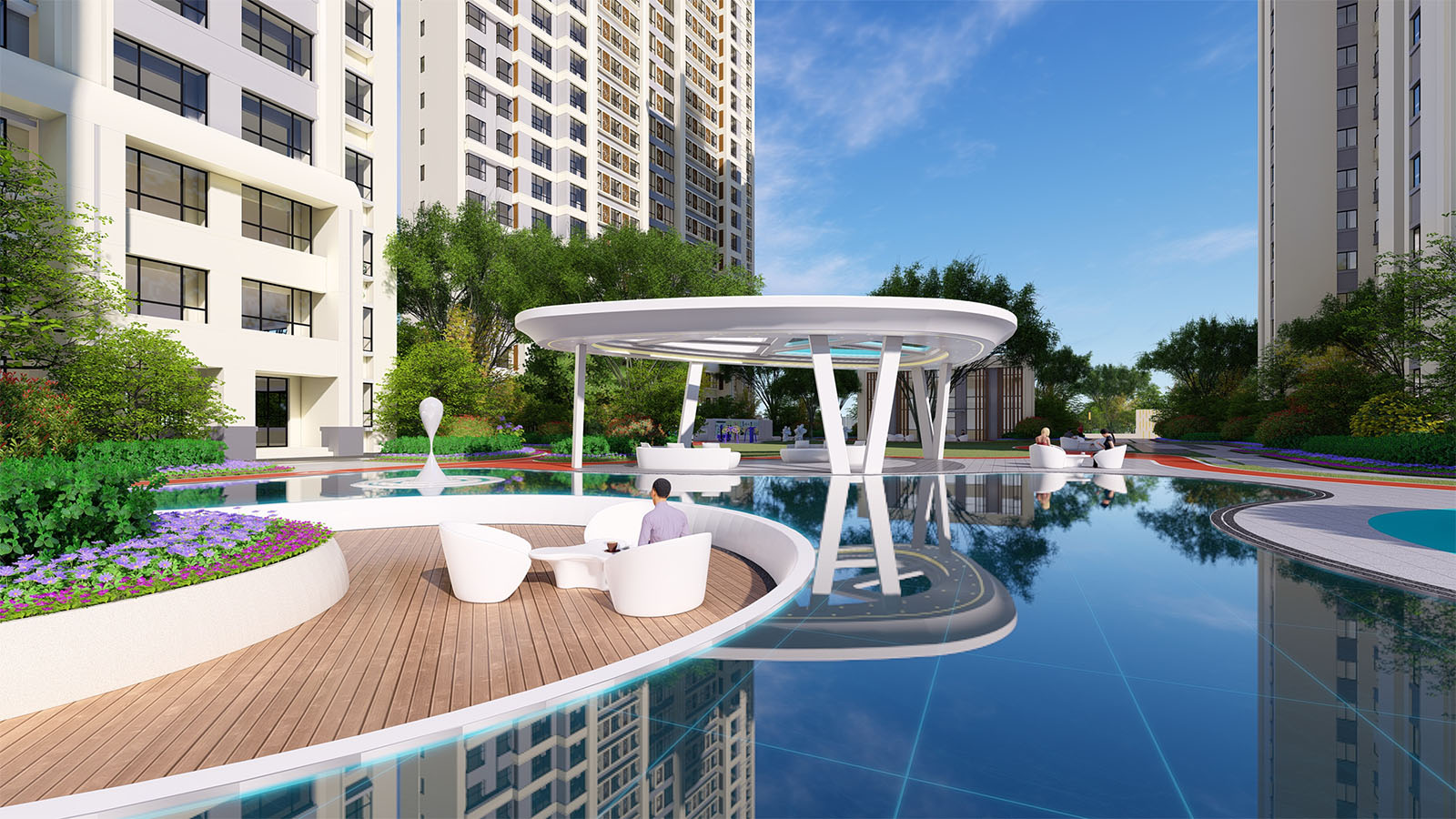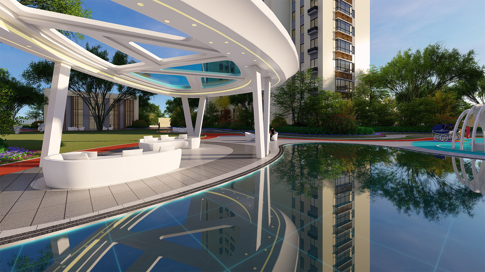 優(yōu)雅靈動(dòng)的線型、簡(jiǎn)潔純凈的色彩語言,富有韻律的構(gòu)圖和曲線形式,表達(dá)各生活功能區(qū)之間相互依纏的空間關(guān)系,線條柔和,以曲線構(gòu)成使的場(chǎng)地更具延展性,采用環(huán)繞式的手法體現(xiàn)出溫潤(rùn)與舒適的人居氛圍。